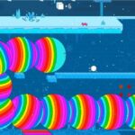 • A fine-tuned platformer with tight controls to dash, dodge, and jump off surfaces to survive against neon spiders, massive rainbow worms, and bomb-dropping moondogs